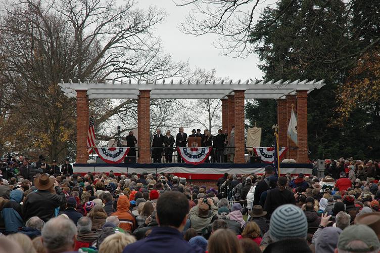 It was a cool, gray November morning when we reached Gettysburg, where we discovered we were not the only people who decided to show up today. A sizeable crowd was gathering around the rostrum in the National Cemetery, including a good number of school students. We headed down to the Soldiers National Monument, which is closer to the actual spot where Lincoln spoke, because the day’s events would begin there with a wreath-laying ceremony.