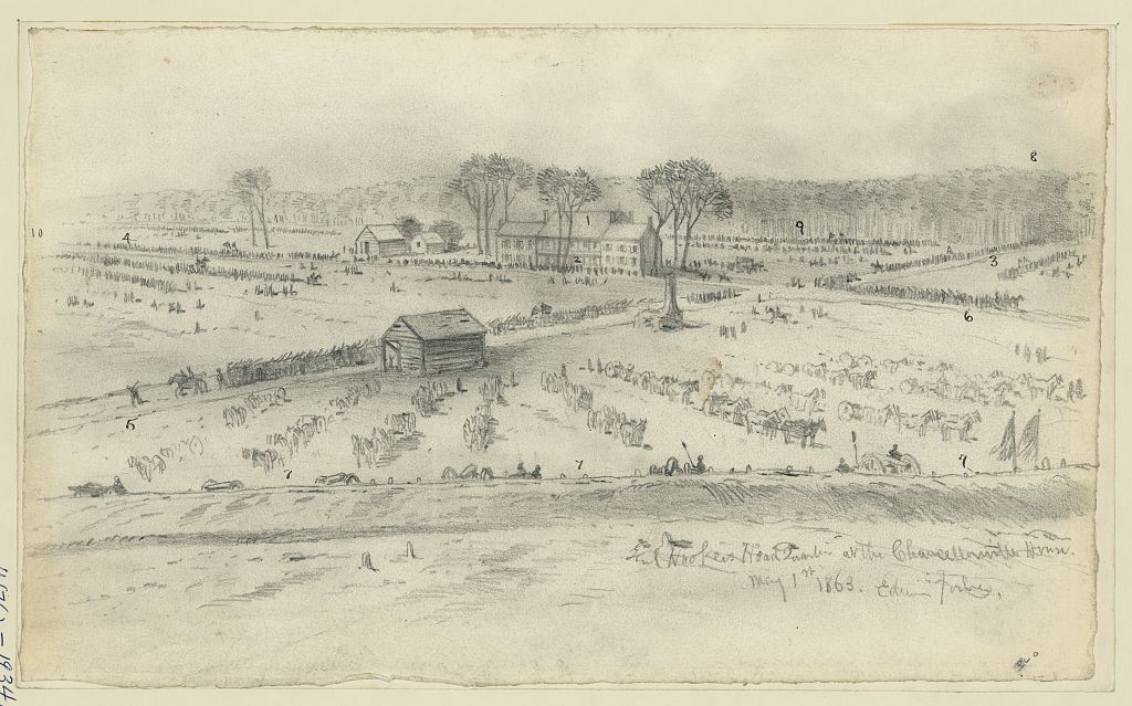 Edwin Forbes drew this sketch of the Chancellorsville house, where Hooker had his headquarters during the battle. He was on the front porch when a cannonball hit the house, striking Hooker with debris. The general although knocked unconscious and probably severely concussed, retained command after awakening. (Library of Congress)