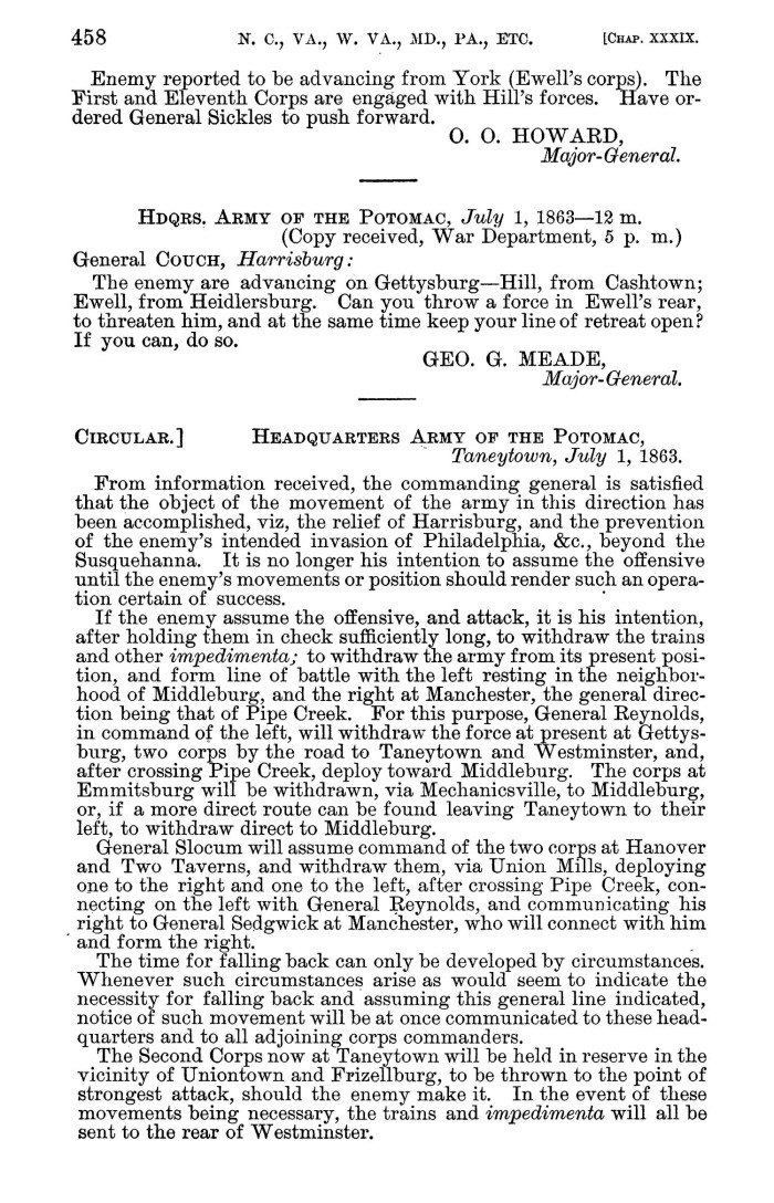 It was while at Taneytown on July 1 that Meade issued what became known as his Pipe Creek Circular. The pages of the Official Records with that order are below.
