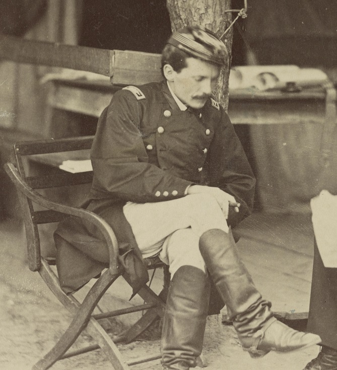 If you saw the style of officers’ wives that come here, I am sure you would wish to stay away. Quelle experience had I yesterday! I was nearly bored to death, and was two hours and a half late for my dinner. Oh, list to my harrowing tale. I was in my tent, with my coat off, neatly mending my maps with a little paste, when Captain [Adolphus] Cavada poked in his head (he was gorgeous in a new frockcoat). “Colonel,” said he, “General Humphreys desires that you will come and help entertain some ladies!” I held up my pasty hands in horror, and said,”What!” “Ladies!” quoth Cavada with a grin; “ a surprise party on horseback, thirteen ladies and about thirty officers.” There was no moyen; I washed my hands, put on the double-breaster, added a cravat, and proceeded, with a sweet smile, to the tent, whence came a sound of revelry and champagne corks. Such a set of feminine humans I have not seen often; it was Lowell factories broken loose and gone mad. They were all gotten up in some sort of long thing, to ride in. One had got a lot of orange tape and trimmed her jacket in the dragoon style; another had the badge of the Third Corps pinned all askew in her hat; a third had a major’s knot worked in tarnished lace on her sleeve; while a fourth had garnitured her chest by a cape of grey squirrel-skin. And there was General Humphreys, very red in the face, smiling like a basket of chips, and hopping round with a champagne bottle, with all the spring of a boy of sixteen. He spied me at once, and introduced me to a Mrs. M , who once married somebody who treated her very badly and afterwards fortunately went up; so Mrs. M seemed determined to make up lost time and be jolly in her liberty. She was quite bright; also quite warm and red in the face, with hard riding and, probably, champagne. Then they said they would go over to General [John] Sedgwick’s, and General Humphreys asked if I would not go, too, which invitation it was not the thing to refuse; so I climbed on my horse, with the malicious consolation that it would be fun to see poor, modest Uncle John with such a load!