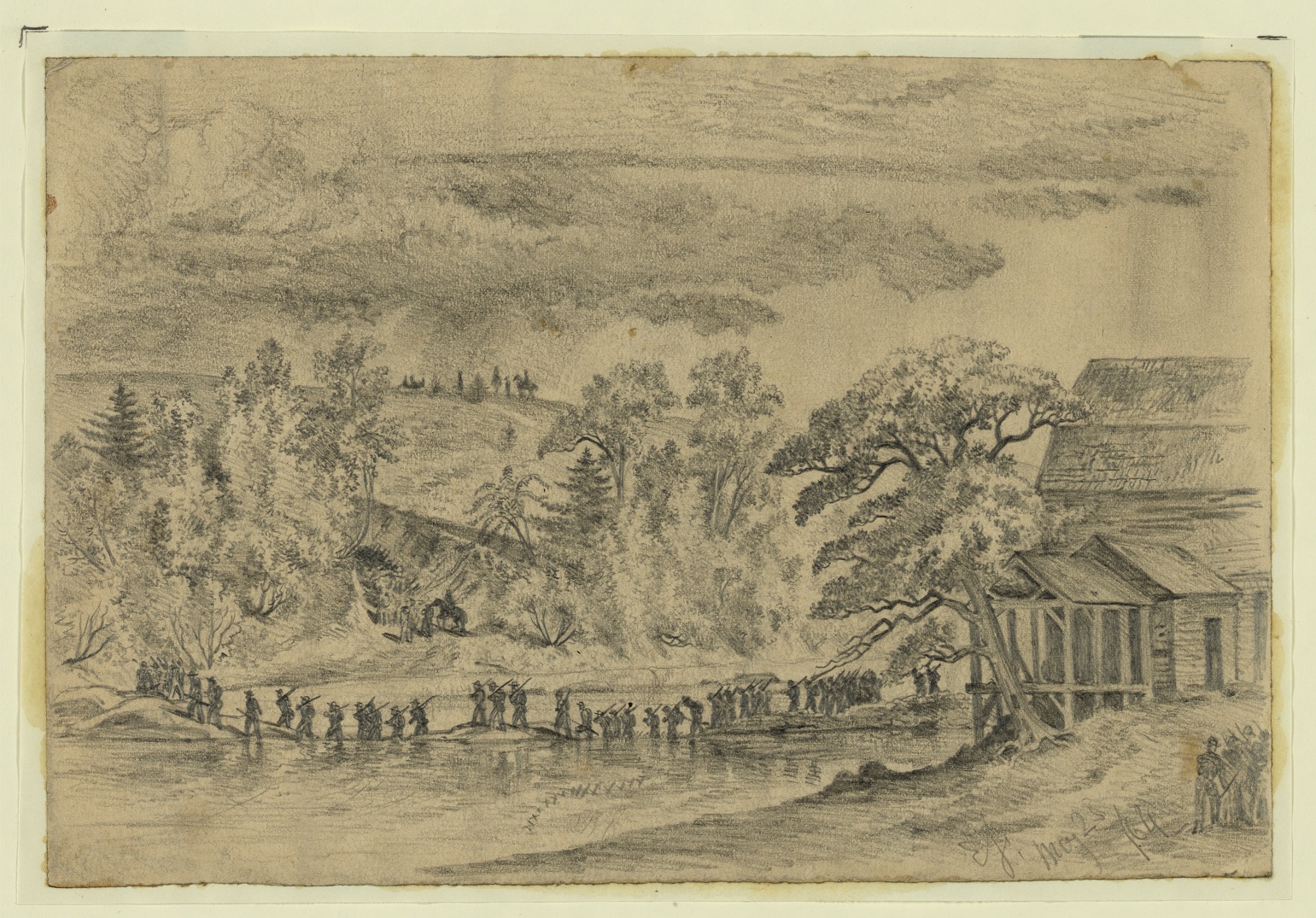 Edwin Forbes titled this sketch from May 23 “The Army of the Potomac (5th Corps) crossing the North Anna, at Jerico [sic] Ford.” Click to enlarge (Library of Congress).