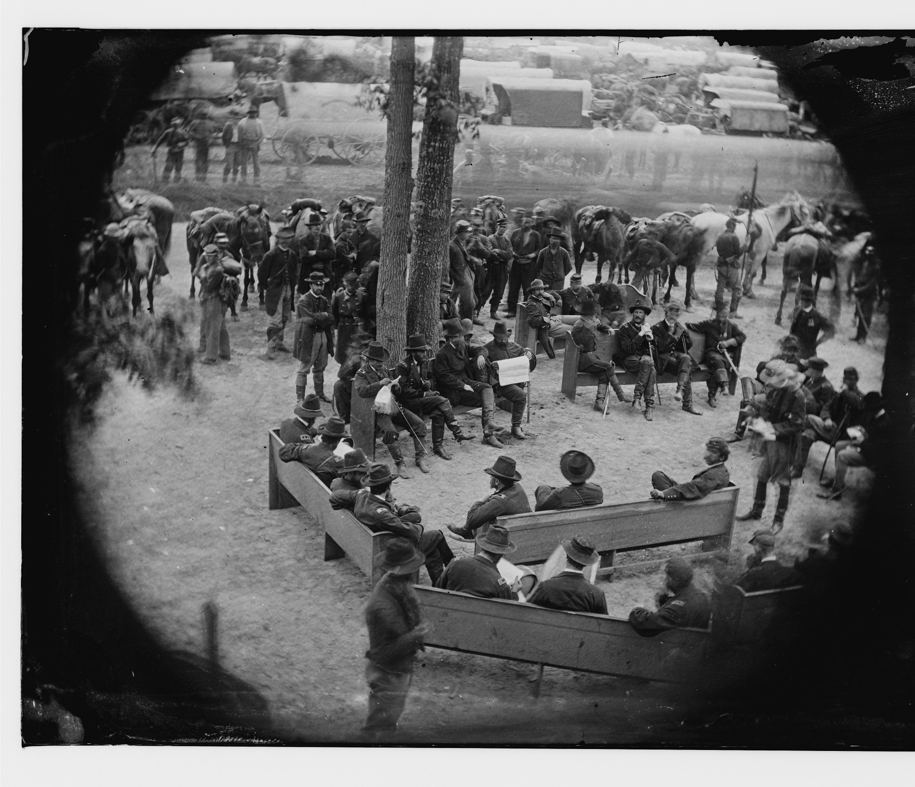 Ambrose Burnside (reading paper) and staff at Cold Harbor, June 11 or 12, 1864. That’s photographer Mathew Brady in the straw hat (Library of Congress).