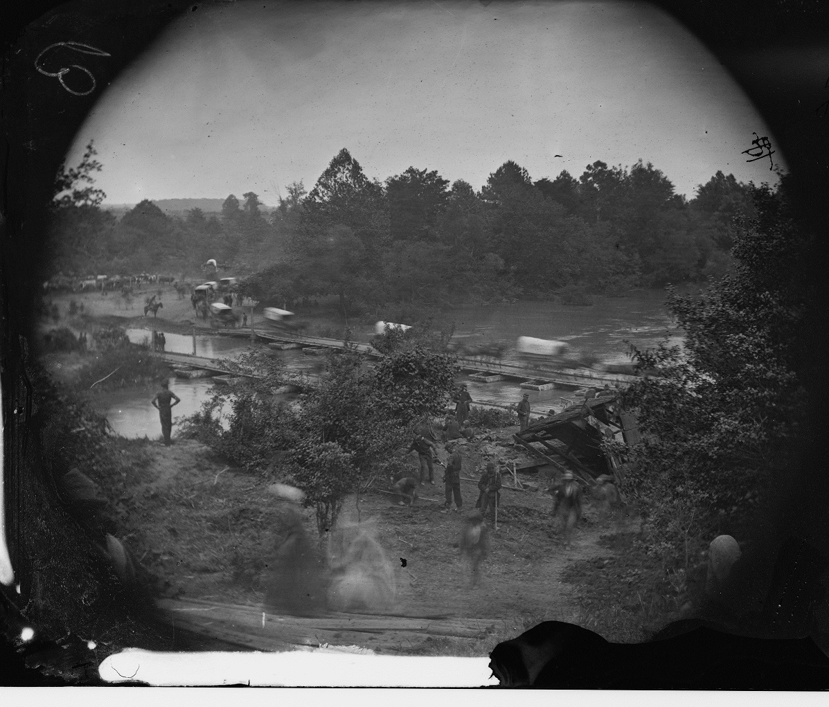 Another one of O’Sullivan’s images from May 24. Of this one he said, “Jericho Mills, Va. Party of the 50th New York Engineers building a road on the south bank of the North Anna, with a general headquarters wagon train crossing the pontoon bridge” (Library of Congress).