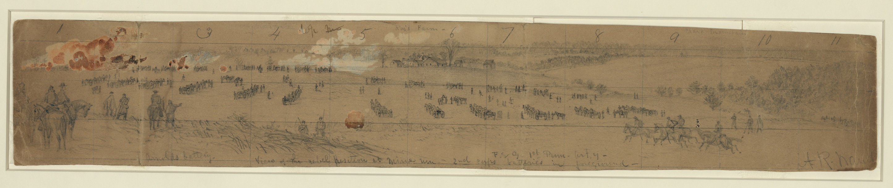Alfred Waud labeled this drawing “June 2nd Position nr. Cold Harbor–rifle pits in the front.” On the back he wrote, “A union battery held this hill at the battle of Gaines Mill tenaciously from a position near the buildings looking to the right of the picture, at right angles to the present line of battle.” Click to enlarge (Library of Congress).