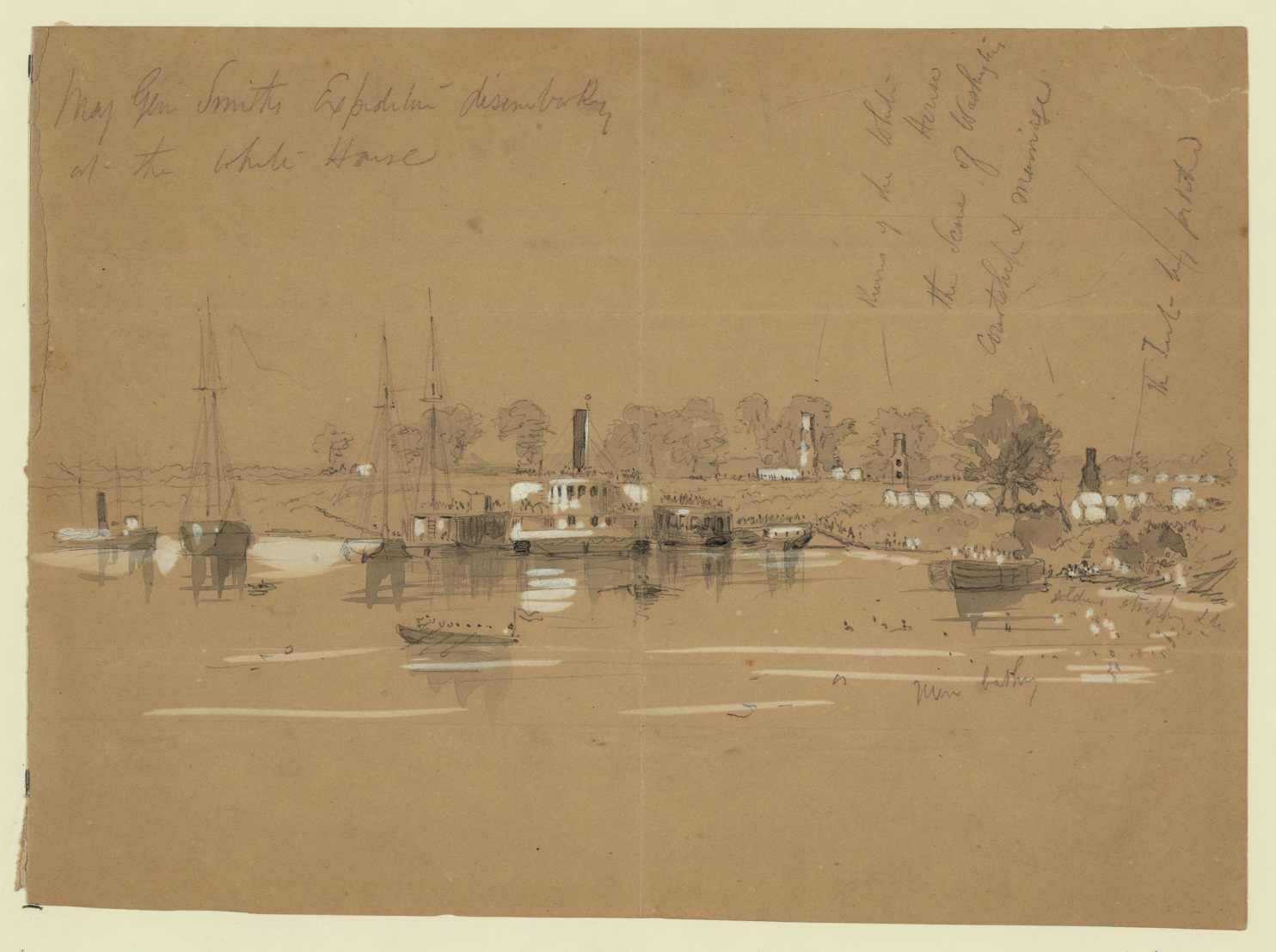 ![Artist William Waud sketched the arrival of "Baldy" Smith and the XVIII Corps at White House landing on the Pamunkey on May 18. On the front Waud wrote, "Ruins of the White House; the scene of Washington's courtship & marriage; the tent by Pilchard." This White House belonged to Rooney Lee, son of Robert E. George Washington had indeed courted Martha here. On the back Waud wrote, "This is only a small portion of the force shown here as there were many large vessels employed such as the John Brooks, the George Leary, the Escort, the Metamone[sic]-all similar to the Hudson river & sound boats but which I have not the opportunity of sketching if Mr Parsons has drawings of these vessels if the view is thought interesting enough they might be introduced covered with troops hanging on like bees. For description see the letters of Mr. Winser in the Times. W.W." Harpers published an engraving on June 18. Click to enlarge (Library of Congress).](https://searching4meade.com/wp-content/uploads/2014/06/smith-disembarks.jpg?w=600&h=447)