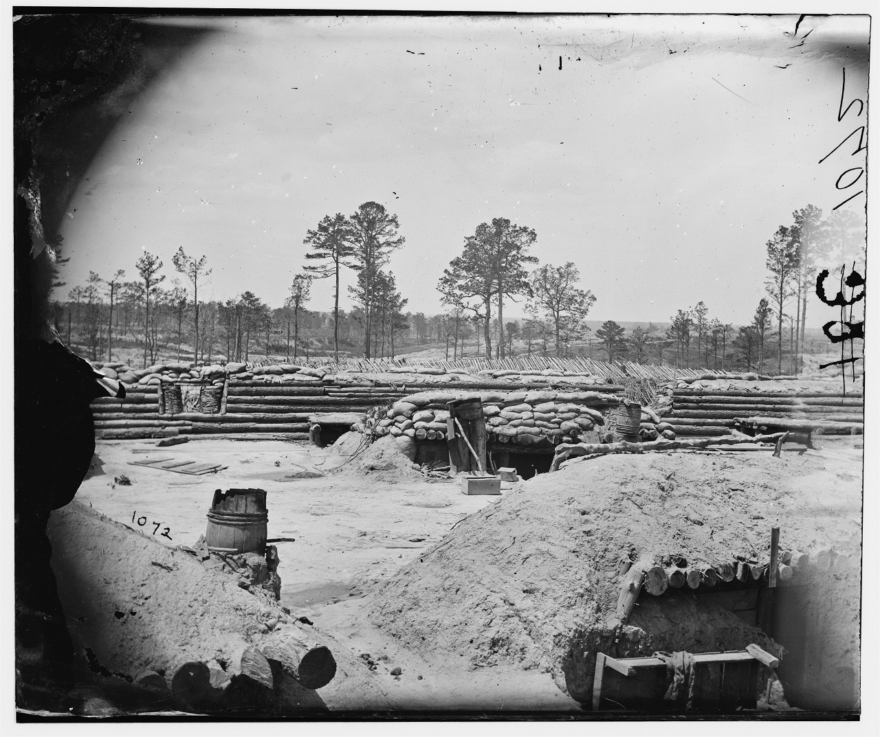 The General rode along the whole front of the new line and carefully examined it, accompanied by his Staff and by the taciturn Roebling. R. is a character, a major and aide-de-camp and engineer, and factotum to General Warren. He is a son of the German engineer, Roebling, who built the celebrated suspension bridge over the Niagara River. He is a light-haired, blue-eyed man, with a countenance as if all the world were an empty show. He stoops a good deal, when riding has the stirrups so long that the tips of his toes can just touch them, and, as he wears no boots, the bottoms of his pantaloons are always torn and ragged. He goes poking about in the most dangerous places, looking for the position of the enemy, and always with an air of entire indifference. His conversation is curt and not garnished with polite turnings. “What’s that redoubt doing there?” cries General Meade. “Don’t know; didn’t put it there,” replies the laconic one. The Chief growled a little while at the earthwork, but, as that didn’t move it, he rode onward. We passed at a clever time, for, a few minutes after, the Rebel skirmishers made a rush, and drove ours out of a house, and their bullets came over the corner of a field where we had been. Thereat our skirmishers made a counter-rush and drove theirs again away from the house, and our cannon fired and there was a small row generally. Some of our earthworks were really very workmanlike, handsomely sloped in front, and neatly built up with logs in the rear. It is really a handsome sight to get a view of half a mile of uniform parapet, like this, and see the men’s shelter-tents neatly pitched in the pine woods, just in rear, while in front a broad stretch of timber has been “slashed,” to give a good field of fire and break up any body of troops advancing to attack. It is quite interesting, too, to see a redoubt going up. The men work after the manner of bees, each at the duty assigned. The mass throw up earth; the engineer soldiers do the “revetting,” that is, the interior facing of logs. The engineer sergeants run about with tapes and stakes, measuring busily; and the engineer officers look as wise as possible and superintend. . . .