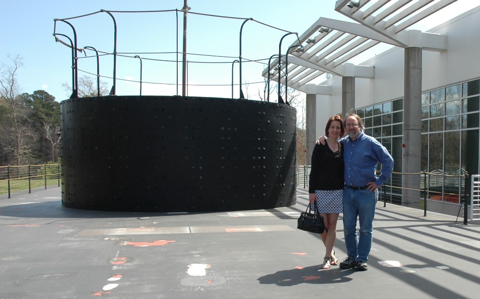 My wife and I pose on the deck of the life-size Monitor mockup.