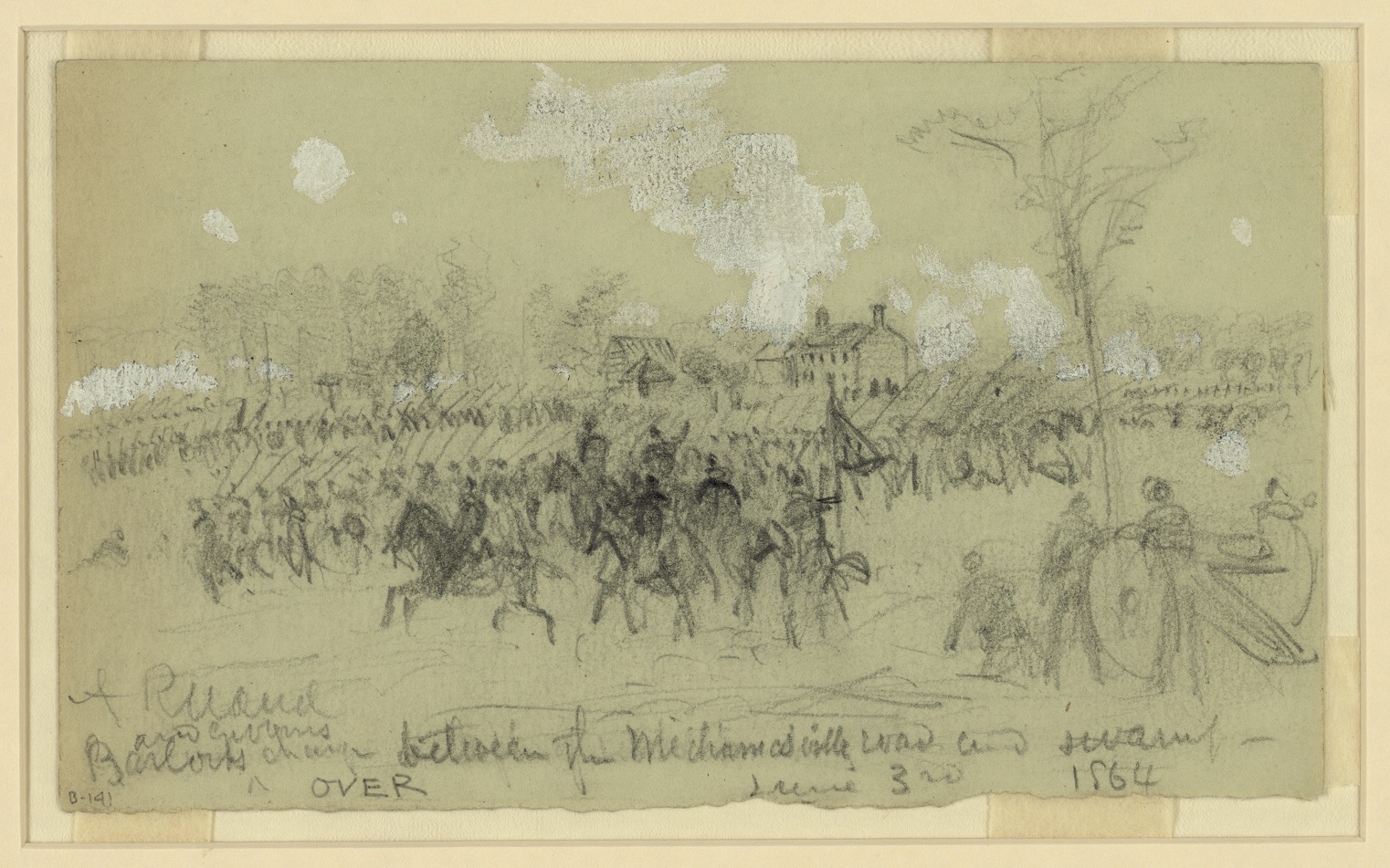 “Barlow and Gibbons charge between the Mechanicsville road and swamp, June 3rd, 1864.” By Alfred Waud. Inscribed on the back: “This was a prominent position at the battle of Gaines Mill 1862. Our line was then at right angles to the present advance and faced to the right. Barlow charged to the left of the house, and Gibbon on the right.” Inscribed vertically: “Gains [sic] Mills or Cold Harbor/Gen Barlows & Gibbons June 3rd 1864.” Click to enlarge (Library of Congress).