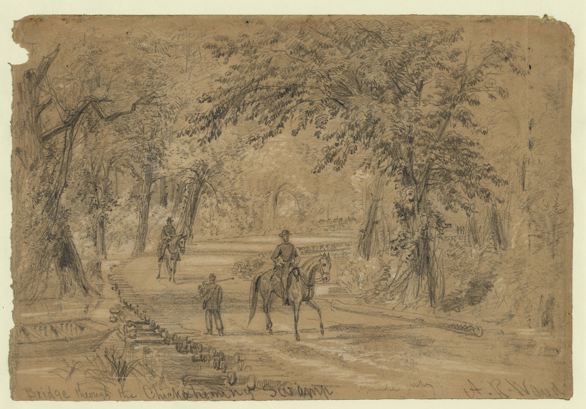 “Bridge Through the Chickahominy Swamp” by Alfred Waud depicts the landscape the Army of the Potomac would have to cross during its flanking movement (Library of Congress).