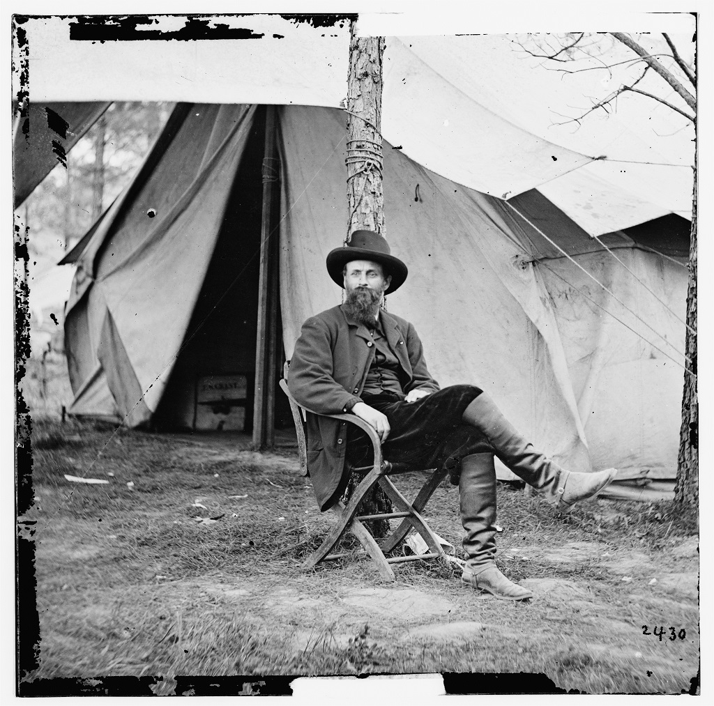 We have the usual play of rumor about cabinets — everybody seems inclined to heave out Stanton: some to heave him up to the Supreme Court — some to heave him down to unknown depths of nothingness. Many would fain fancy Ben Butler in the chair of War, where he would be certain to make things spin either for good or for bad. How he will get on, across the James, I know not. He lost a strong man in Ord, wounded; and in Birney, dead, also: Birney was one who had many enemies, but, in my belief, we had few officers who could command 10,000 men as well as he. He was a pale, Puritanical figure, with a demeanor of unmovable coldness; only he would smile politely when you spoke to him. He was spare in person, with a thin face, light-blue eye, and sandy hair. As a General he took very good care of his Staff and saw they got due promotion. He was a man, too, who looked out for his own interests sharply and knew the mainsprings of military advancement. His unpopularity among some persons arose partly from his promotion, which, however, he deserved; and partly from his cold covert manner. I always felt safe when he had the division; it was always well put in and safely handled. The longer I am in the army, the more I see that great bodies of men take their whole tone from a few leaders, or even from one. I climbed on a horse and took a ride to visit Captain Sleeper, whose camp I easily recognized by its neat appearance. He always has things in a trig state about him. His own domicile was a small log cabin, with a neat brick chimney, very smooth-looking, but made in truth of only odd bits of brick, picked up at random and carefully fitted by a skilful Yank. The chimney-piece was of black walnut, made indeed from the leaf of an old table, discovered in the neighborhood. As to his tongs, a private, of prospective views, picked them up sometime last summer, and had carried them, ever since, in waggon! For arras he had artillery horse-blankets. The Sleeper is now more content, having his battery full, new sergeants appointed, and a prospect of officers. His only grief is that with three years’ service and many battles he is only a captain. You see Massachusetts has not her batteries in a regiment and can’t have field officers. So Sleeper’s only hope is a brevet.