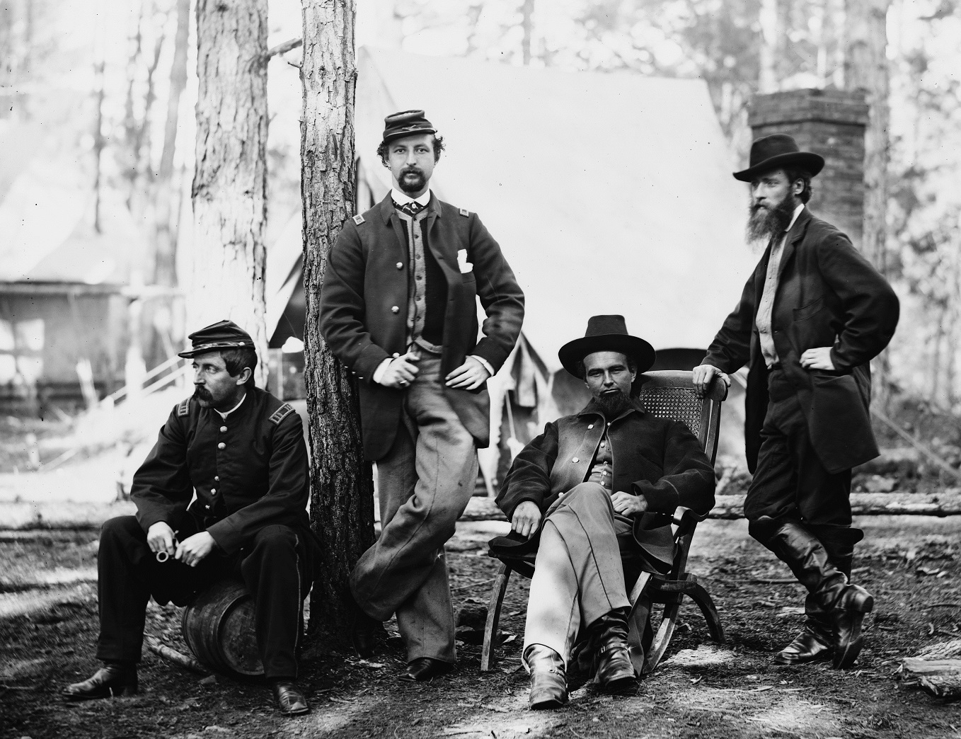 Personnel of the 10th MA Battery (and a guest), taken in December 1863 at Brandy Station. Pictured (left to right)  are Capt. Samuel A. McClellan, Capt. J. Henry Sleeper, Capt. O'Neil W. Robinson, and artist  Alfred R. Waud. Click to enlarge (Library of Congress).