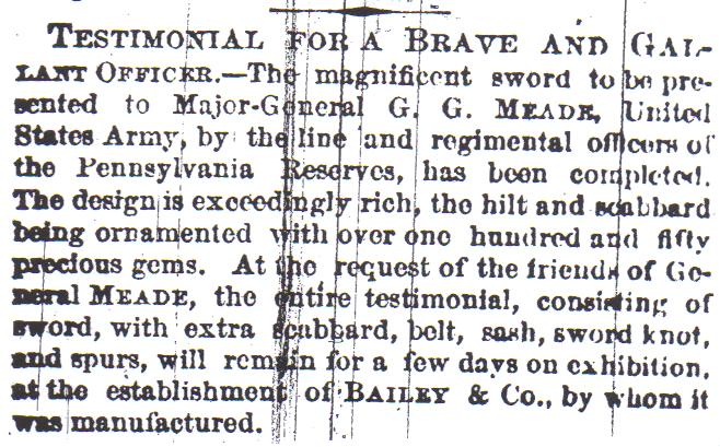 Meade’s correspondence taken from The Life and Letters of George Gordon Meade, Major-General United States Army, Vol. 2, (New York: Charles Scribner’s Sons, 1913), pp. 202-3. The newspaper article is on p. 341. Available via Google Books.